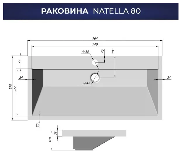 Мебельный умывальник Natella 80 794х379х120 изготовлен из искусственного мрамора. Верхний слой Гелькоута образует декоративно защитное покрытие. Не содержит вредных для здоровья человека веществ, экологически безопасный. Шумопоглощающая поверхность. Имеет готовое отверстие под смеситель, без перелива. Раковина может быть встроена на мебель, в столешницу и на подстолье.