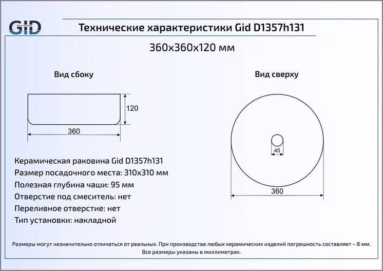 Раковина для ванной Gid D1357h131 монтируется на столешницу или мебель.