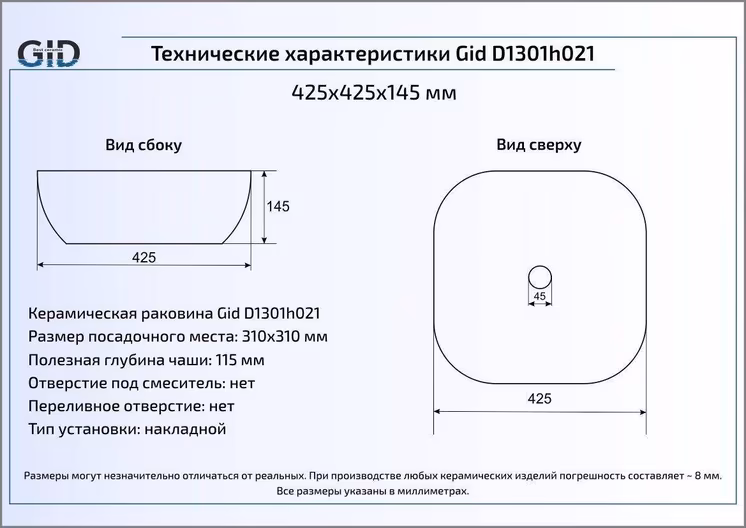 Раковина для ванной Gid D1301h021 монтируется на столешницу или мебель.
