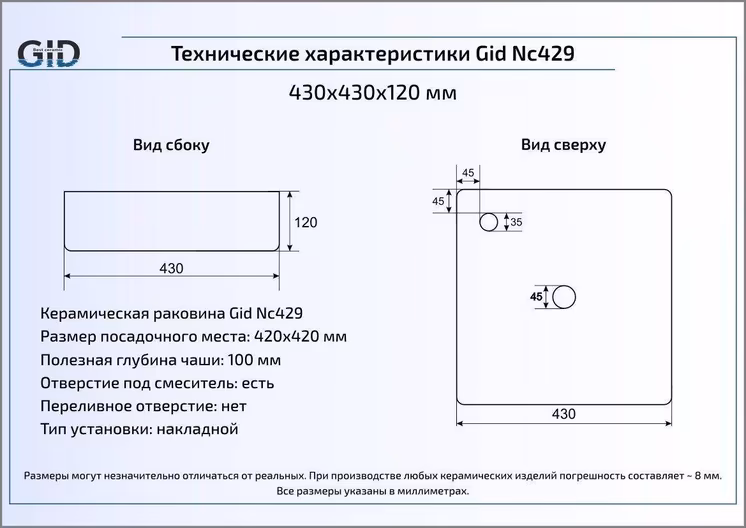 Раковина для ванной Gid Nc429 монтируется на столешницу или мебель.