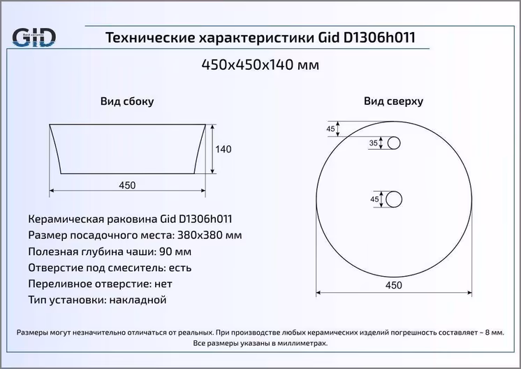 Раковина для ванной Gid D1306h011 монтируется на столешницу или мебель.