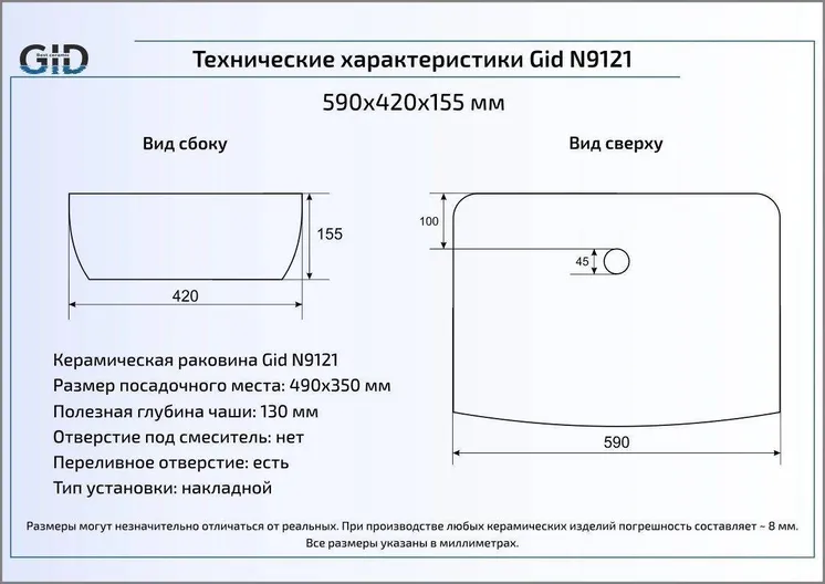 Раковина для ванной Gid N9121 монтируется на столешницу или мебель.