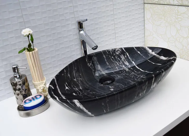 Керамическая дизайнерская раковина Gid Mnc206 покрыта каменной фактурой черного оттенка с белыми прожилками путём современных высокотехнологических процессов.