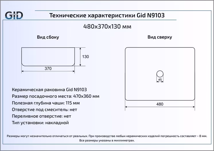 Раковина GID N N9103 накладная, белый