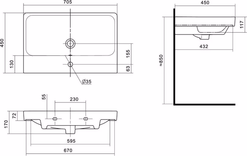 - Расположение отверстия под смеситель: