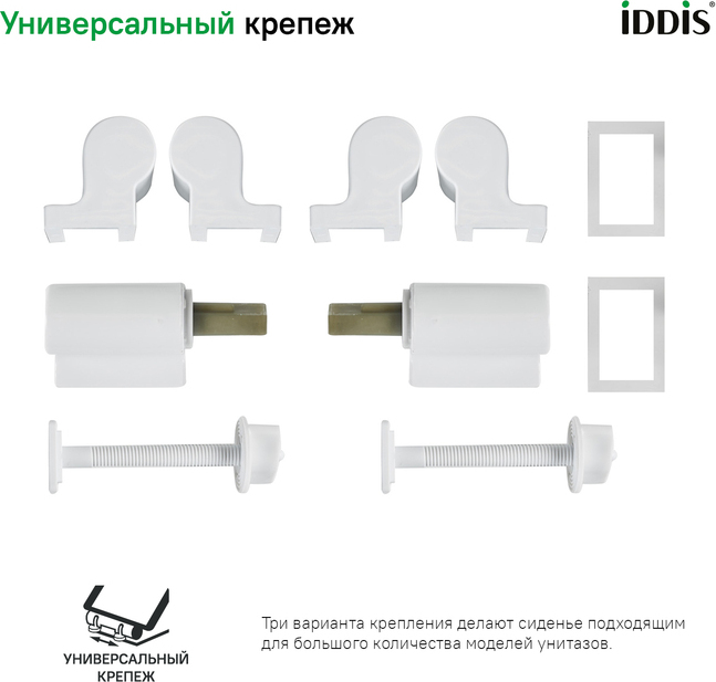 Универсальный крепеж: три варианта крепления, входящие в комплект сиденья, позволяют установить его на максимально большое количество моделей унитазов. Не нужно тратить время на дополнительные замеры. Крепления прочно и надежно фиксируют сиденье на унитазе и не расшатываются со временем.