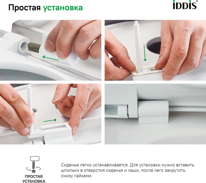 Пластиковое сиденье для унитаза IDDIS® белого цвета классической округлой формы. Сиденье изготовлено из полипропилена – он обладает высокой износостойкостью, устойчивостью к агрессивным химическим веществам, экологичен и безопасен для здоровья.