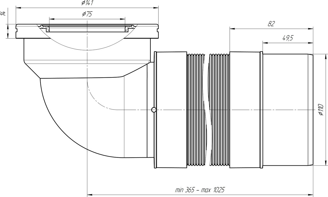 | Удлинитель гибкий для унитаза выход в канализацию 110 мм угол 90 градусов длина 365-1085мм. Для пластиковых труб |