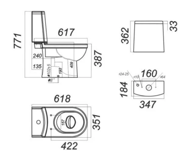 - Чаша унитаза - 1 шт. Бачок - 1 шт. Крышка-сидение - 1 шт. Смывной механизм - 1 шт.