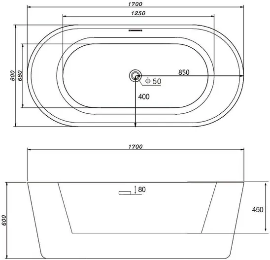 Акриловая ванна Abber AB9209 170x80x60 слив-перелив, стальной каркас