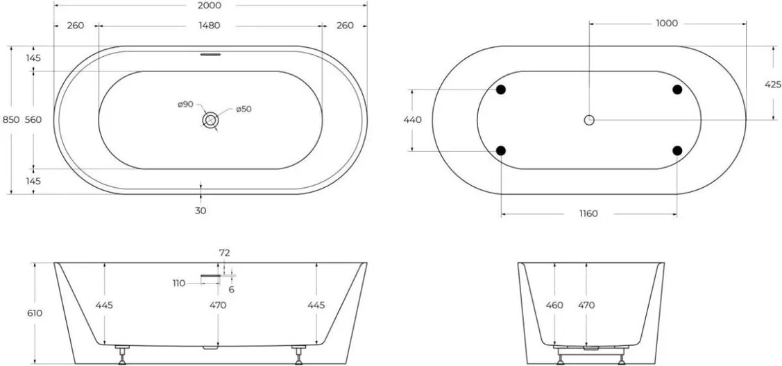 Расположение перелива: сливное отверстие посередине дна ванны стандартно