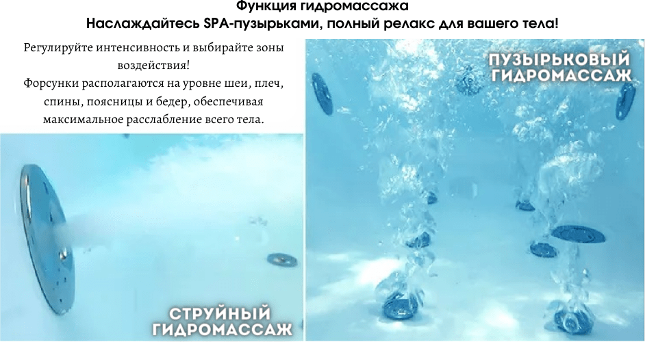 Гидромассажные форсунки: 4 форсунки для массажа спины, 4 – для ног и 2 боковые.