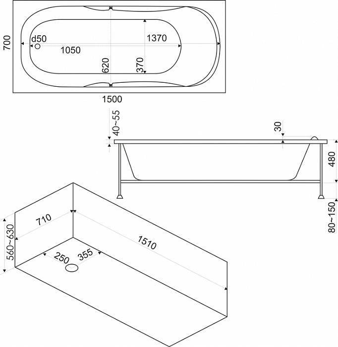 Акриловая ванна Bas Рио ST ПЛЮС ВС00038 150x70 каркас (стандарт плюс)