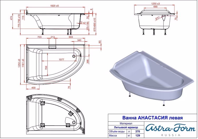 Ванна из искусственного камня Astra Form Анастасия 01010025 182х125 левая СТ045123