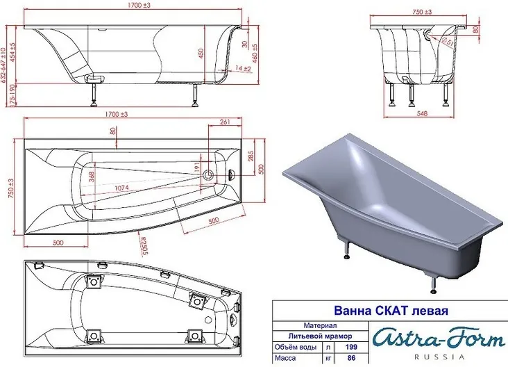 Ванна из искусственного камня Astra Form Скат 1700x750/500 1010014 левая, литой мрамор УТ-00165945