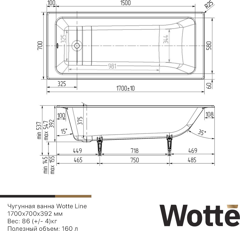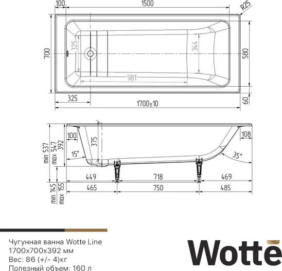 Чугунная ванна Wotte Line 170x70 УТ-00127262