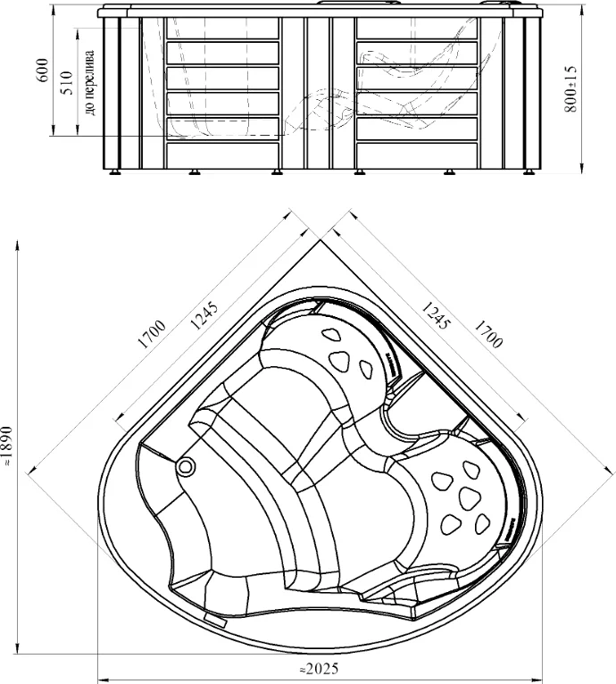 Собранный мини-бассейн на раме-подставке со сливом-переливом (полуавтомат), фронтальная панель — белый пластик, 17 гидромассажных форсунок, 14 аэромассажных форсунок, «SPA-контроллер», хромотерапия 2 лампы, смеситель, излив-ручка «Рикарди» — 2 шт., подголовник — 2 шт., система «Turbo-pool»