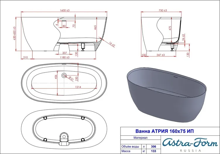 Ванна из искусственного камня Astra Form Атрия 1600х750 1010065 Solid УТ-00185510