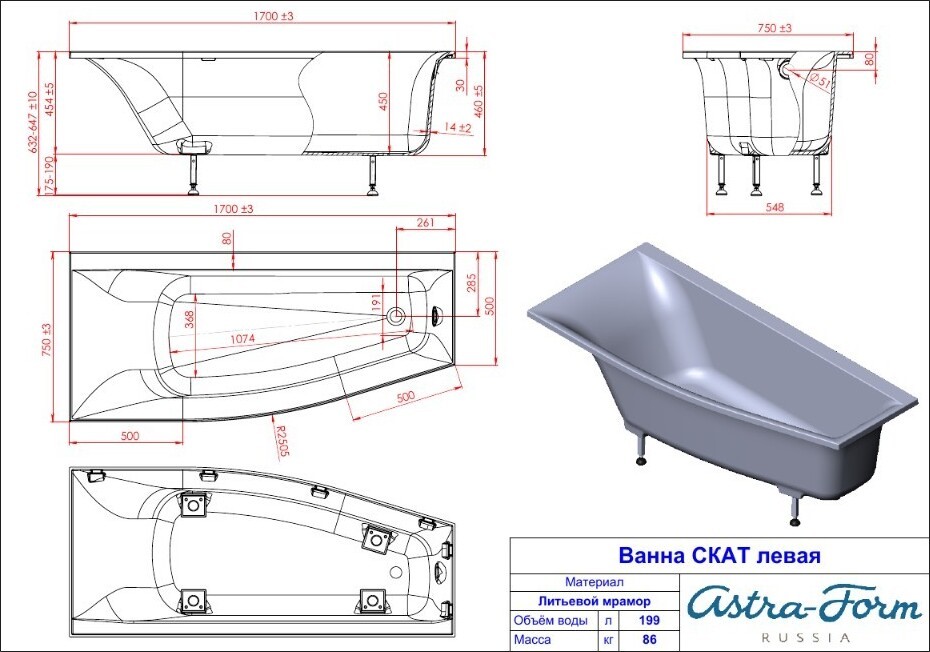 Ванна из полиэфирной смолы Astra Form Скат 01010082 1700х750х500 левая, Solid Surface УТ-00185538