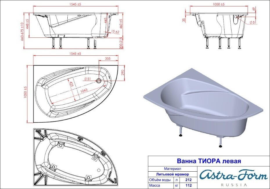 Ванна из полиэфирной смолы Astra Тиора 01010084 1545х1050 левая, Solid Surface УТ-00185540