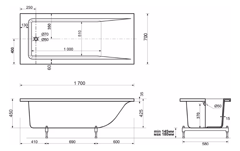 Ванна из искусственного камня Эстет Дельта ФР-00000651 170x70 УТ-00083717