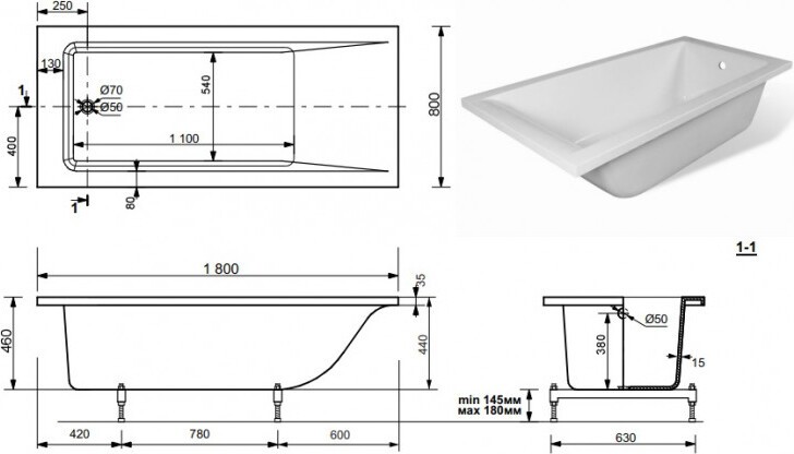 Ванна из искусственного мрамора Эстет Дельта 180x80 ФР-00000669 УТ-00092255