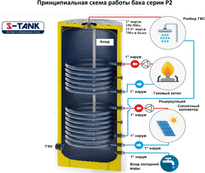 Описание: — Бак предназначен для аккумулирования горячей воды от различных источников тепла. Бак серии P улучшает гибкость системы ГВС, позволяя Вам аккумулировать постоянный объем горячей воды, использовать рециркуляцию ГВС для повышения комфорта пользования. А возможность подключения электрического нагревателя в отверстие с внутренней резьбой 2» (для баков 750 и 1000 литров) или 1 1/2″ (для баков до 500 литров включительно) в нижней части бака, делает бак более универсальным. Бак может совместно работать со следующими источниками тепла: