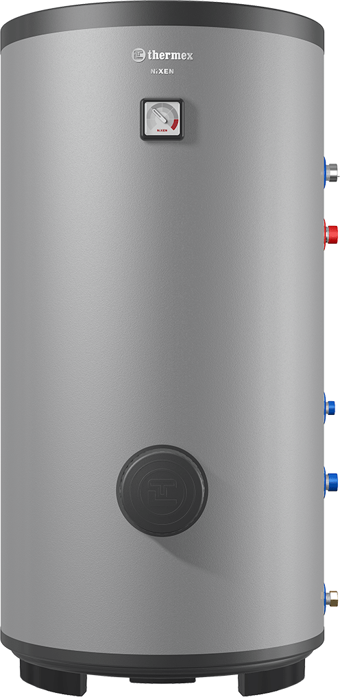 - Один водонагреватель – два варианта нагрева. Водонагреватель косвенного нагрева Nixen осуществляет нагрев за счет тепла системы отопления. Внутри установлен теплообменник из нержавеющей стали: модели объемом 150 и 200 литров оснащены теплообменниками мощностью 17 000 Вт, 250 литров – 19 000 Вт и 300 литров – 24 000 Вт. Дополнительно можно установить нагревательный элемент мощностью 6 000 Вт, а также панель управления. Таким образом, Thermex Nixen можно эксплуатировать как водонагреватель с косвенным нагревом или превратить его в бойлер комбинированного типа.