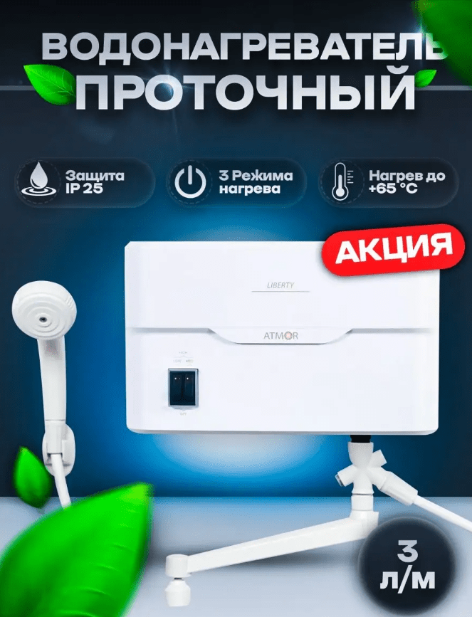 ATMOR LIBERTY 5 KW TAP быстро нагревает воду до 55 градусов. Такая температура отлично подходит для бытовых нужд и не вызывает перерасход электричества. Конструкция с душевой лейкой и краном обладает стандартной резьбой входного/выходного патрубков 1/2". Модель дополнена ограничителем нагрева, защищающим от кипения воды и повреждения прибора.