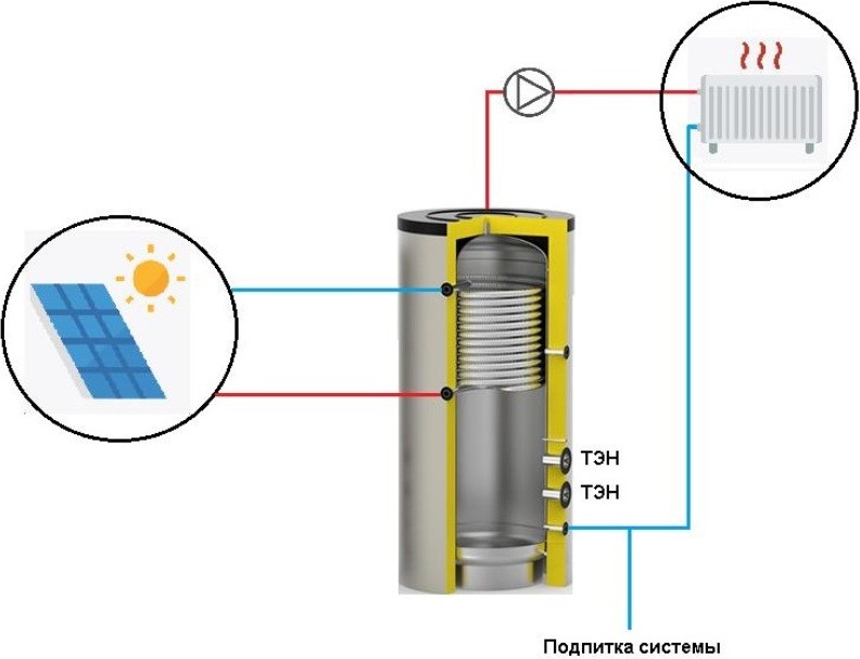 Бак предназначен для аккумулирования тепла от электротэнов и дополнительных источников тепла (солнечный коллектор либо котел)