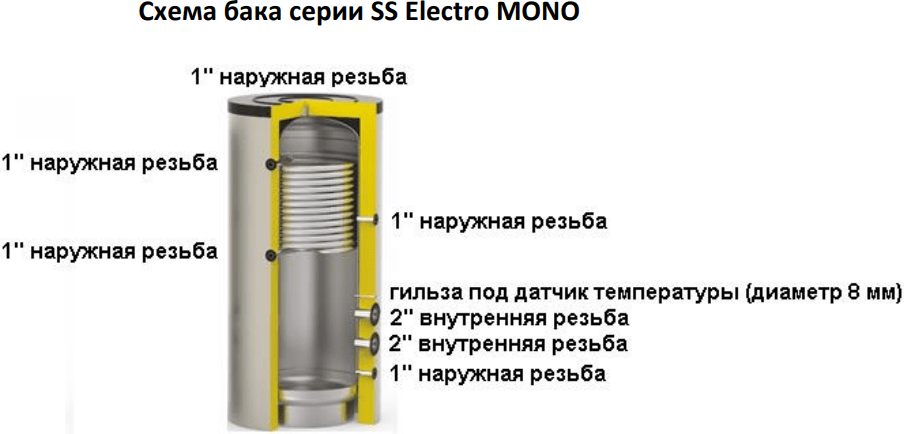 Также бак оснащен спиральным теплообменником для подключения дополнительного источника тепла, такого как газовый котел, котел на твердом топливе, солнечный коллектор, тепловой насос либо централизованная система отопления.