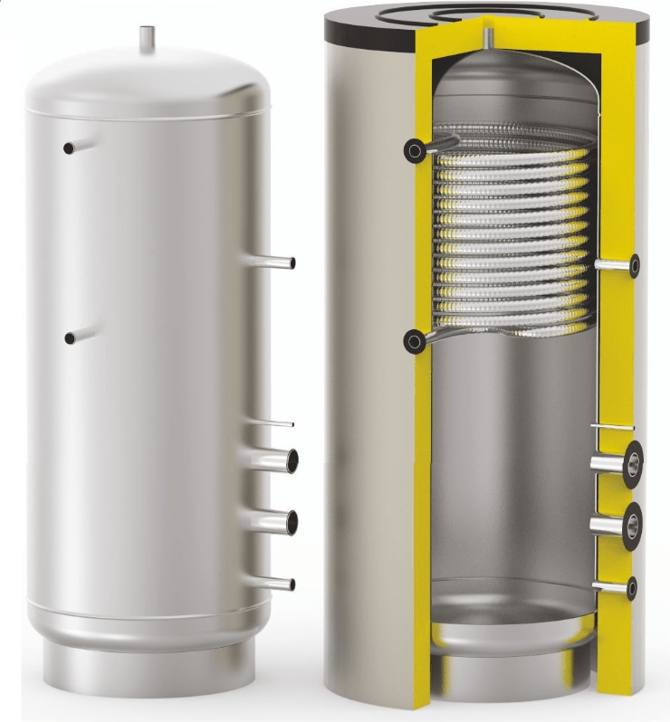 Также бак оснащен спиральным теплообменником для подключения дополнительного источника тепла, такого как газовый котел, котел на твердом топливе, солнечный коллектор, тепловой насос либо централизованная система отопления.