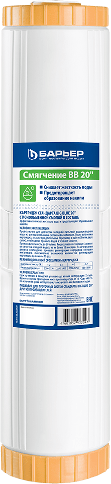 Картридж для очистки воды, предназначенный для эксплуатации в системах водоснабжения с повышенной концентрацией солей жесткости. Соответствует стандарту Big Blue 20.