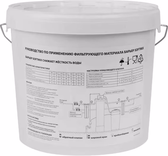 БАРЬЕР Засыпка СОФТМИКС, 12,5 л С204303 - мульти-компонентная ионообменная загрузка для умягчения водопроводной и скважинной воды при высоком содержании солей жесткости. Кварцевый песок в составе загрузки является подложкой для поддержки фильтрующих компонентов и равномерного распределения потоков воды при обратной промывке.