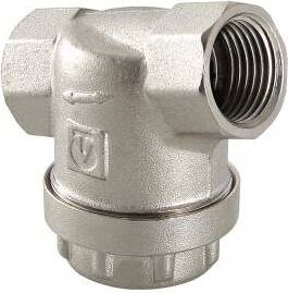 (VT.386.N) Универсальный фильтр механической очистки. Направление движения жидкости – любое. Благодаря колбе, повернутой навстречу потоку, пригоден для установки на вертикальных участках трубопровода при движении потока снизу–вверх. Корпус и пробка фильтра выполнены из латуни марки CW617N (европейский стандарт EN 12165), никелированы. Между ними имеется прокладка из EPDM. Пробка оснащена отверстием для пломбировки. Размер задерживаемых частиц – от 300 мкм. Максимальная рабочая температура фильтруемой среды – 110 °C. Максимальное рабочее давление – 16 бар. Резьба присоединения – внутренняя