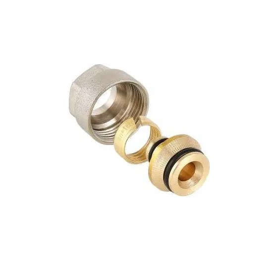 Латунный фитинг с накидной гайкой и обжимным кольцом для подключения металлополимерной трубы к выходам коллектора или патрубкам иной арматуры диаметром 3/4", стандарт соединения – «евроконус».