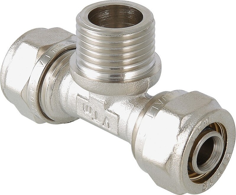 (VTm.333.N) Фитинг обжимной – тройник с переходом на наружную резьбу для присоединения металлополимерных (металлопластиковых) трубопроводов. Резьба фитинга – наружная трубная по ГОСТу 6357.