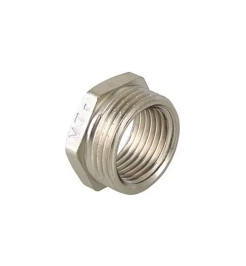 (VTr.581.N) Футорка – фитинг, обеспечивающий соединение труб разного типоразмера, подключение трубопровода к элементу системы с большим диаметром присоединительного патрубка, ремонт (замену) поврежденной резьбы. Изделие выполнено из латуни марки CW617N, никелировано. Резьба – наружная/внутренняя, по типу – трубная цилиндрическая, совместимая с наружной конической (ГОСТ 6211). Шестигранная головка футорки служит ее вкручиванию гаечным ключом. Максимальное рабочее давление использования соединителя зависит от температуры среды: 250 °С – 2,7/1,7 бар, 200 – 3,0/2,7, 120 – 40/25 (до/более 1”).
