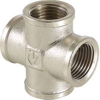 (VTr.760.N) Латунный никелированный четырехсторонний фитинг, равнопроходной. Резьба – внутренняя, цилиндрическая трубная по ГОСТу 6357 (ISO 228, EN 10226), совместимая также с наружной конической трубной резьбой по ГОСТу 6211 (ISO R7).