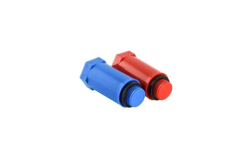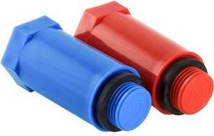 Комплект длинных полипропиленовых пробок (синяя и красная), предназначенных для герметичного перекрытия трубопровода в неиспользуемых патрубках фитингов или арматуры с внутренней резьбой.