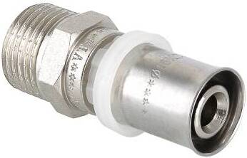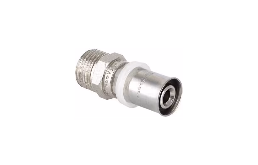 Пресс-фитинг с переходом на наружную резьбу предназначен для соединения металлопластиковой или РЕХ-трубы с элементом системы, имеющим внутреннюю резьбу.