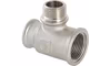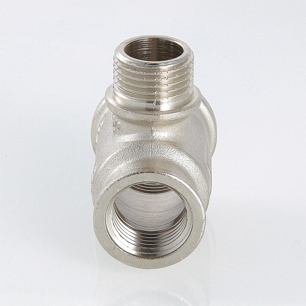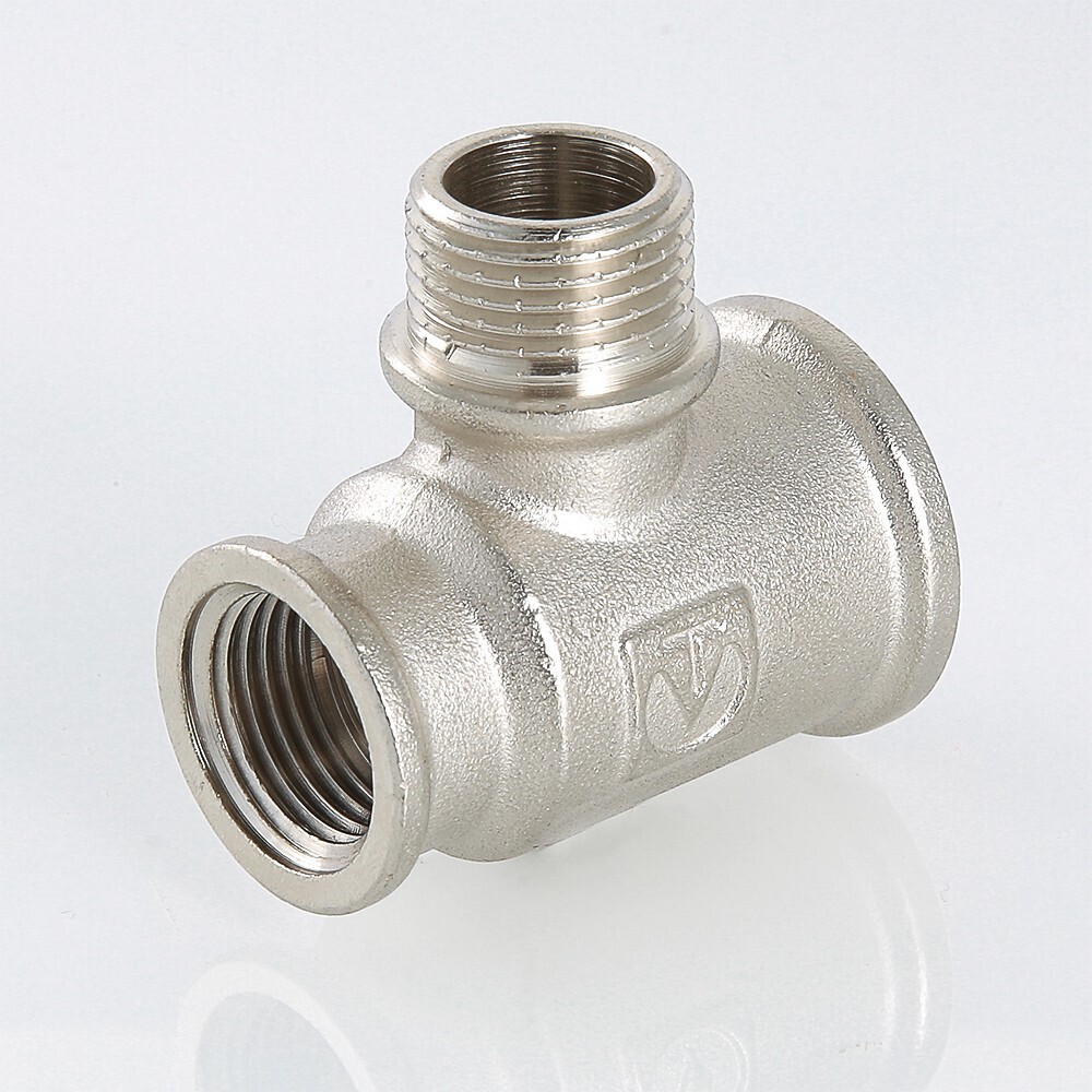 Резьбовой фитинг – тройник переходной с переходом на наружную резьбу изготовлен из латуни марки CW617N методом горячего штампования с последующим нанесением никелевого гальванопокрытия. Применяется для создания разъемных резьбовых соединений на трубопроводах из стальных, медных, латунных, пластиковых и металлопластиковых труб. Комбинация присоединительных патрубков данной модели позволяет смонтировать участок трубопровода соответствующей конфигурации без дополнительных соединителей. Резьба фитинга – трубная цилиндрическая по ГОСТу 6357 (ISO 228, EN 10226), внутренняя/наружная/внутренняя.
