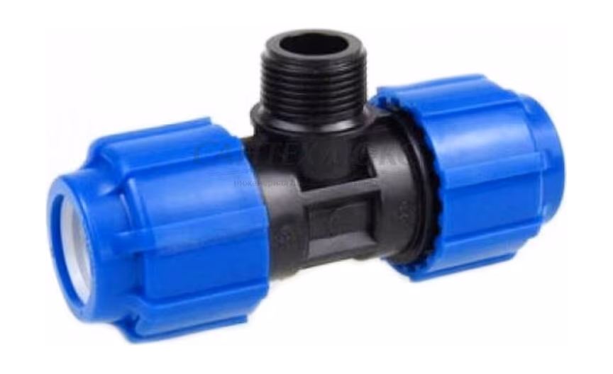 Тройник компрессионный с наружной трубной резьбойявляется универсальной деталью полиэтиленового трубопровода имеющий наружную резьбу с шагом, соответствующим стандартным размерам стальных труб, благодаря чему, этот тройник можно использовать для перехода с ПНД трубы на стальную и наоборот.