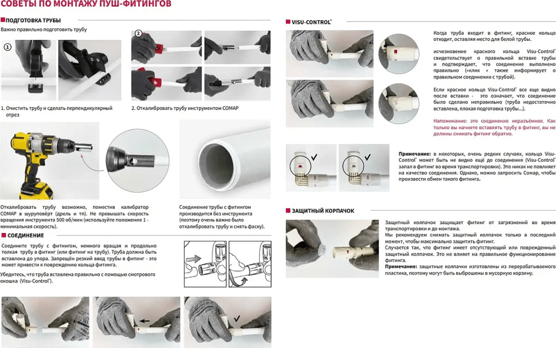 ПРЕИМУЩЕСТВО: соединение за 7 секунд без инструмента, улучшенная гидравлика, снижены потери давления примерно на 5% по сравнению с пресс-фитингами, Visu-Control® индикационное кольцо, позволяет контролировать соединение (в смотровом окошке, красный цвет меняется на белый цвет, когда труба соединена)