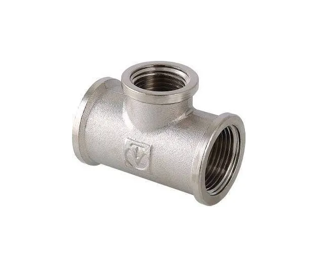 (VTr.750.N) Латунный никелированный трехсторонний фитинг с переходом на меньший диаметр в центральном выходе. Резьба – внутренняя, цилиндрическая трубная по ГОСТу 6357 (ISO 228, EN 10226), совместима также с наружной конической трубной резьбой по ГОСТу 6211 (ISO R7).