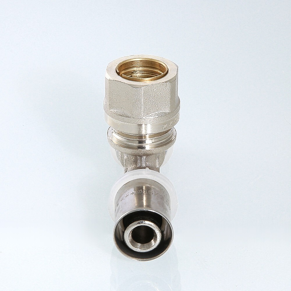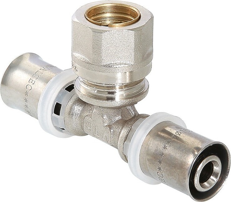 Пресс-фитинг – тройник с переходом на обжимное соединение предназначен для подключения радиатора либо конвектора при плинтусной разводке трубопровода отопления с помощью тонкостенной металлической трубки (медной, латунной, стальной) наружным диаметром 15 мм (в ассортименте продукции VALTEC для такого применения предназначен отвод из нержавеющей стали VTi.960.I). Обжимное соединение соответствует стандарту «евроконус».