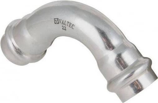 (VTi.951.I) Двухраструбный пресс-угольник из нержавеющей стали обеспечивает соединение тонкостенных стальных труб систем водоснабжения, отопления, иных инженерных и технологических установок с рабочей температурой до 95 °С и давлением до 16 бар. Изделие изготовлено из стали AISI 304. Материал уплотнительных колец – эластомер EPDM Sh70. Фитинг VTi.903.l – угольник для соединения труб под углом 90°. Благодаря бесштуцерной конструкции соединитель обладает малым коэффициентом местного сопротивления – сужение канала практически отсутствует. Фитинг рассчитан на обжатие с помощью пресс-инструмента V-профиля.
