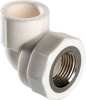 Двухсторонний комбинированный фитинг (полипропиленовый фитинг) для соединения под углом 90° друг к другу полипропиленового трубопровода и компонента инженерной системы с резьбовым подключением.