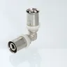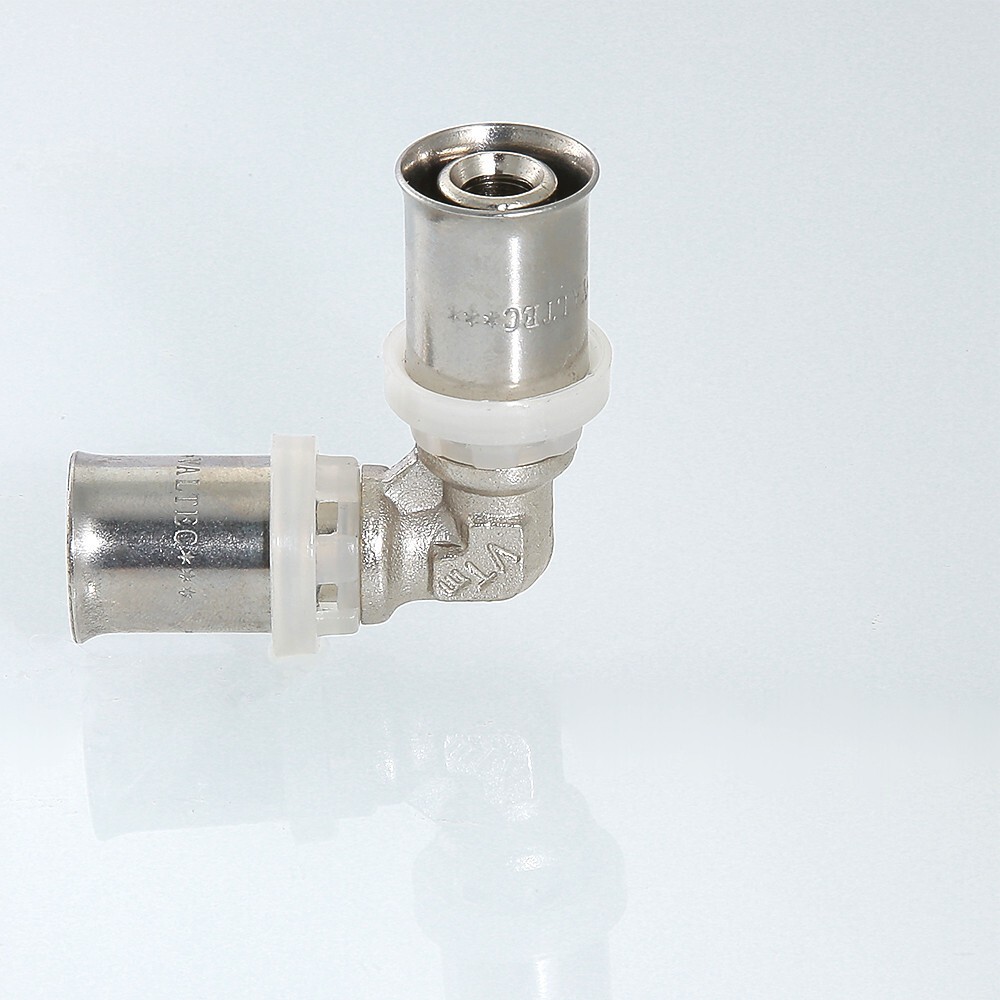 (VTm.251.N) Пресс-фитинг – угольник, обеспечивающий соединение труб (металлопластиковых или из сшитого полиэтилена) под углом 90 градусов. Особенности конструкции изделия, используемые материалы обусловили надежность соединений, повышенную пропускную способность, температурную стойкость, механическую прочность. При изготовлении пресс-угольника используются высококачественные материалы: сантехническая латуни CW617N с никелевым покрытием (корпус), нержавеющая сталь (гильза), EPDM (уплотнительные кольца, 2 шт. для каждого штуцера). Фиксатор, одновременно играющий роль диэлектрической прокладки, делается из нейлона. Монтаж соединителя выполняется пресс-инструментом с насадкой «ТН».