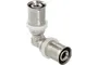 (VTm.251.N) Пресс-фитинг – угольник, обеспечивающий соединение труб (металлопластиковых или из сшитого полиэтилена) под углом 90 градусов. Особенности конструкции изделия, используемые материалы обусловили надежность соединений, повышенную пропускную способность, температурную стойкость, механическую прочность. При изготовлении пресс-угольника используются высококачественные материалы: сантехническая латуни CW617N с никелевым покрытием (корпус), нержавеющая сталь (гильза), EPDM (уплотнительные кольца, 2 шт. для каждого штуцера). Фиксатор, одновременно играющий роль диэлектрической прокладки, делается из нейлона. Монтаж соединителя выполняется пресс-инструментом с насадкой «ТН».